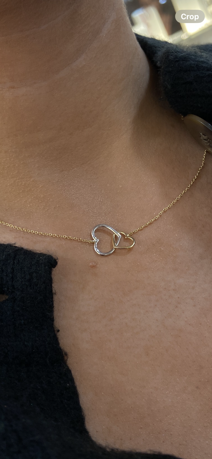 9ct yellow and white gold interlocking heart shaped pendant on a 9ct yellow gold 18” trace chain