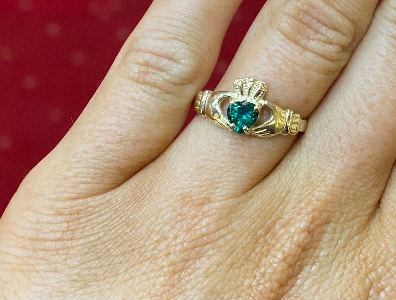 9ct yellow gold Claddagh ring with green stone size O