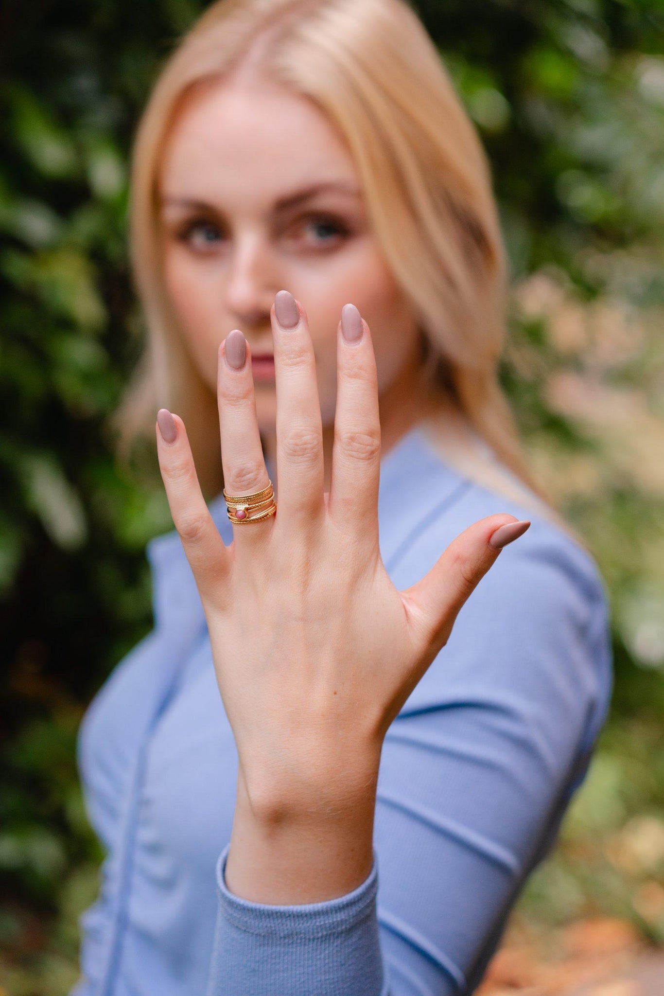 Declare your love in this moment. There’s never been a better time. This 18k gold plated ring band is made up of many smaller, thinner bands, stacked together. These are all held by a single plate at the bottom of the ring while a small rhodonite stone is set atop. The ring will suit those dressing up nights where you’ve got to look your best.