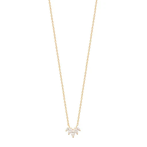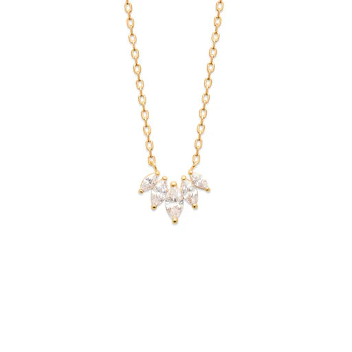 Celebrate all the times you've made your love clear, and how much love you'll give in the future. The 18k gold plated necklace features five marquise cubic zirconia stones set in an arch. The necklace will sit gracefully around your neck, adding a splash of colour to your party dresses, dates and lunches with friends. The collection available has a bracelet, earrings and ring available, as well as a emerald colour version.