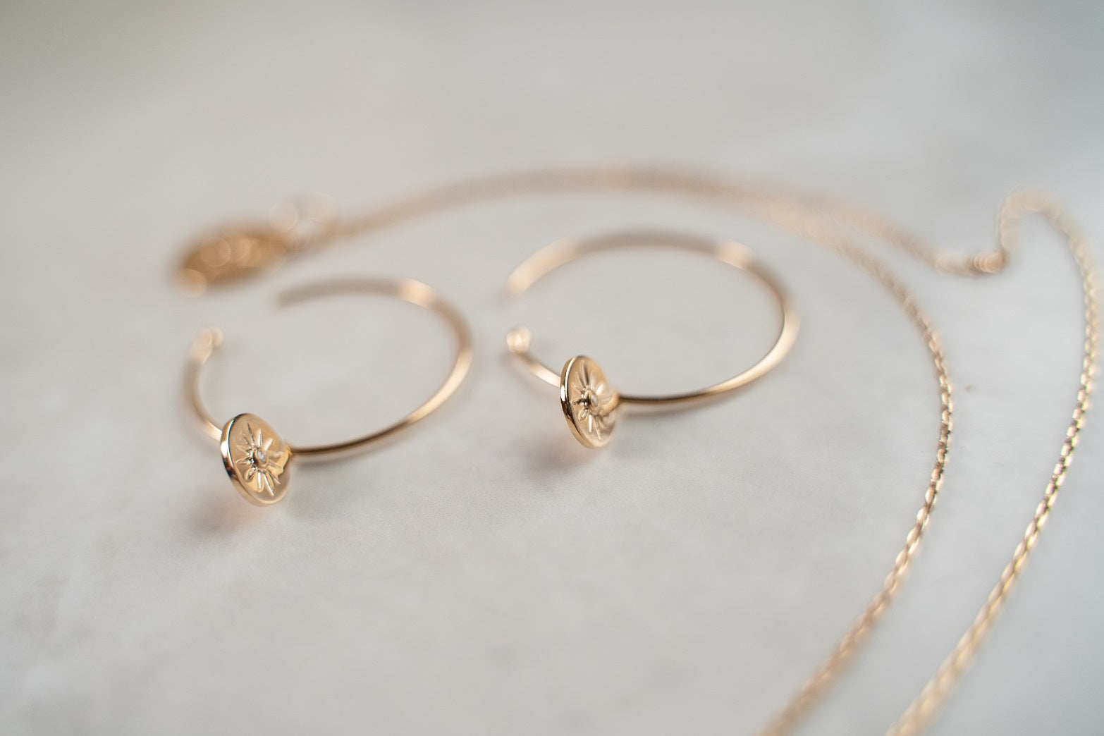 set in an 18 Karat, gold plated disk, hanging from the hoop and engraved with a lovely star design.