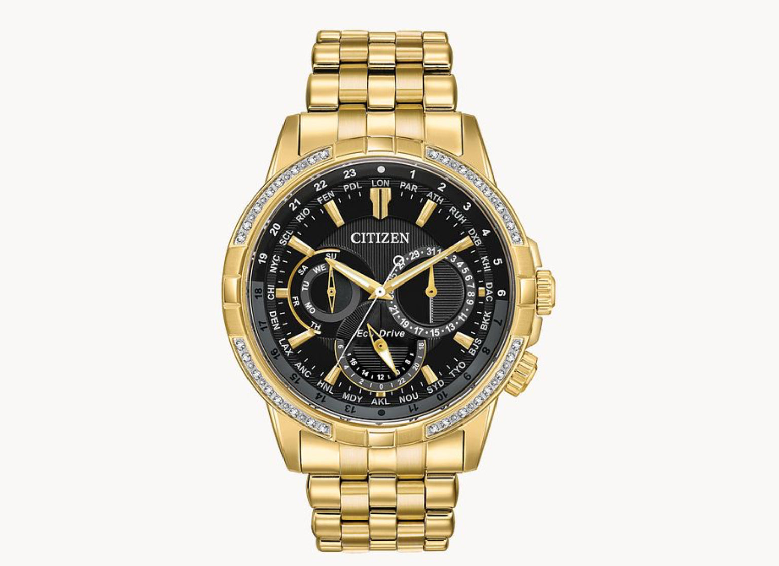 Bring sophistication to your day with the CITIZEN Calendrier. This timeless watch features world time in 24 time zones. Men's watch featured with gold-tone stainless steel case and bracelet with black dial adorned with a diamond bezel. Featuring our Eco-Drive technology – powered by light, any light. Never needs a battery. Caliber number 8729