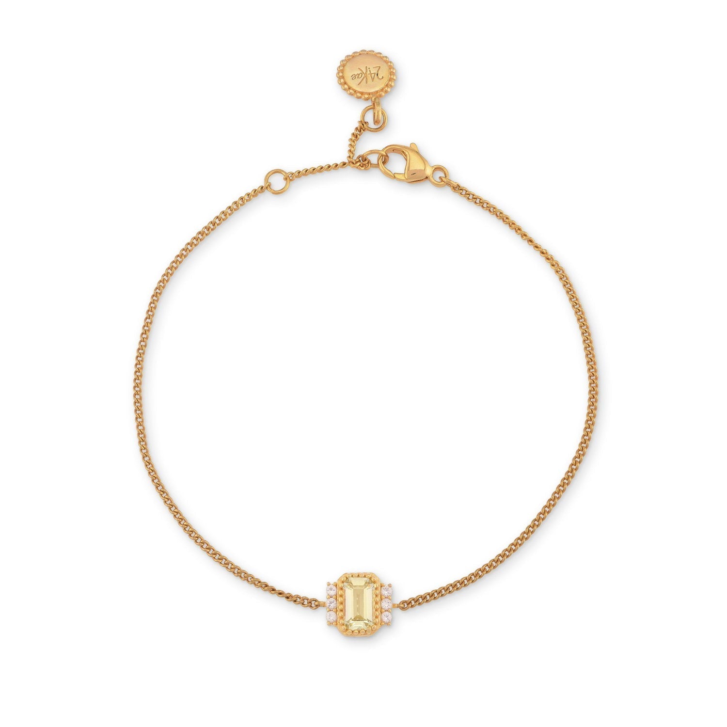 This vintage look 24Kae bracelet has refined gourmet links with a lightgreen rectangular stone in the middle. The bracelet is made of 925 sterling silver plated with 14 karat gold. All 24Kae jewelery is designed with love and an eye for detail by Kae Sutherland. Each 24Kae bracelet has the authentic characteristic of a handmade charm with engraving and a touch of beige. The length of this bracelet is 18 cm.