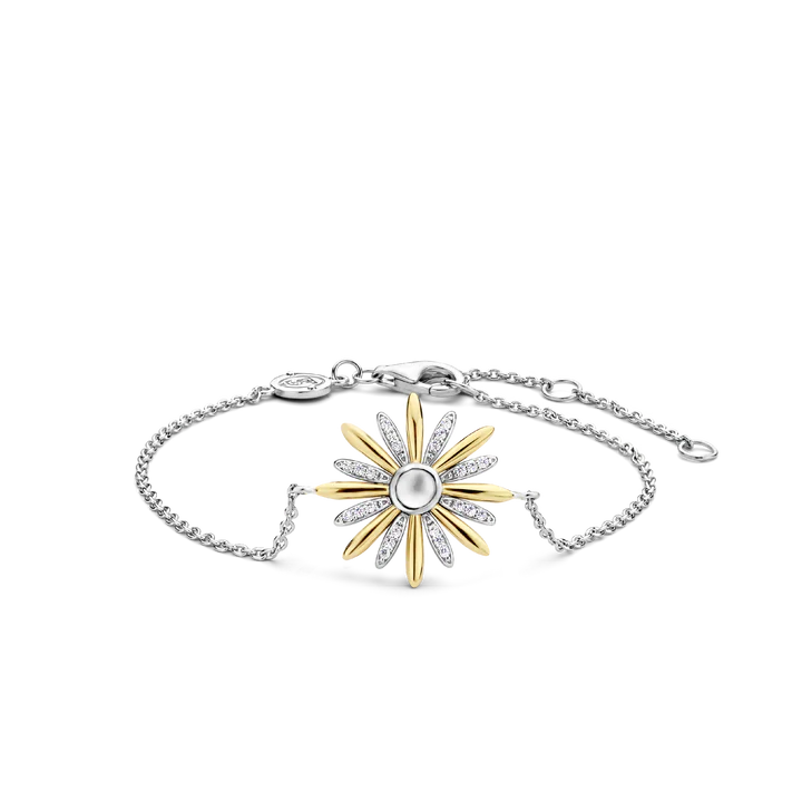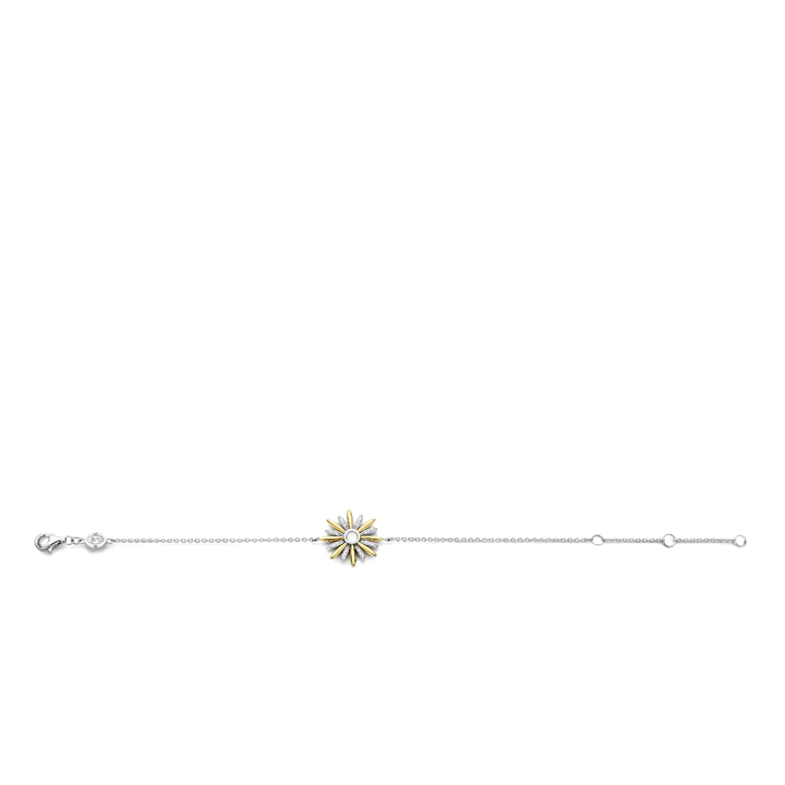 This TI SENTO gold-plated silver bracelet 2917ZY features an elegant star as its centrepiece. A creamy mother of pearl doublet centre stone is decorated by gold-plated and pavé rays. The design was inspired by clear starlit skies and shooting stars. The bracelet is crafted from 925 sterling silver. Carry its light and energy with you day and night. Its extra-safe lock is designed to keep this piece with you all the time.