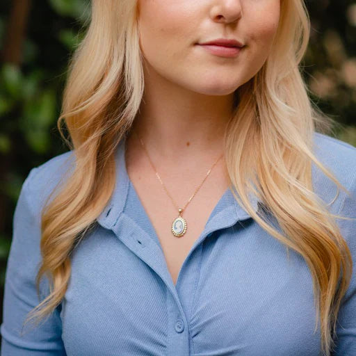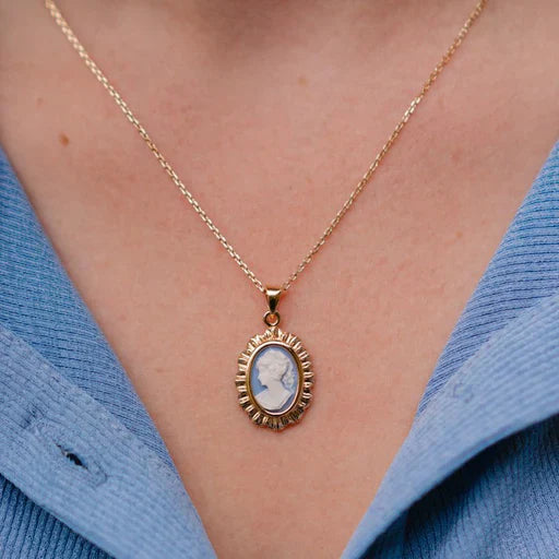 Let out your inner artist with this spectacular cameo pendant. This 18k gold plated pendant features a raised carving of a historic female figure, intricately raised above the base stone, dangling beautifully on the end of a chain. Don’t hesitate to up your style and have that classic look around your neck.