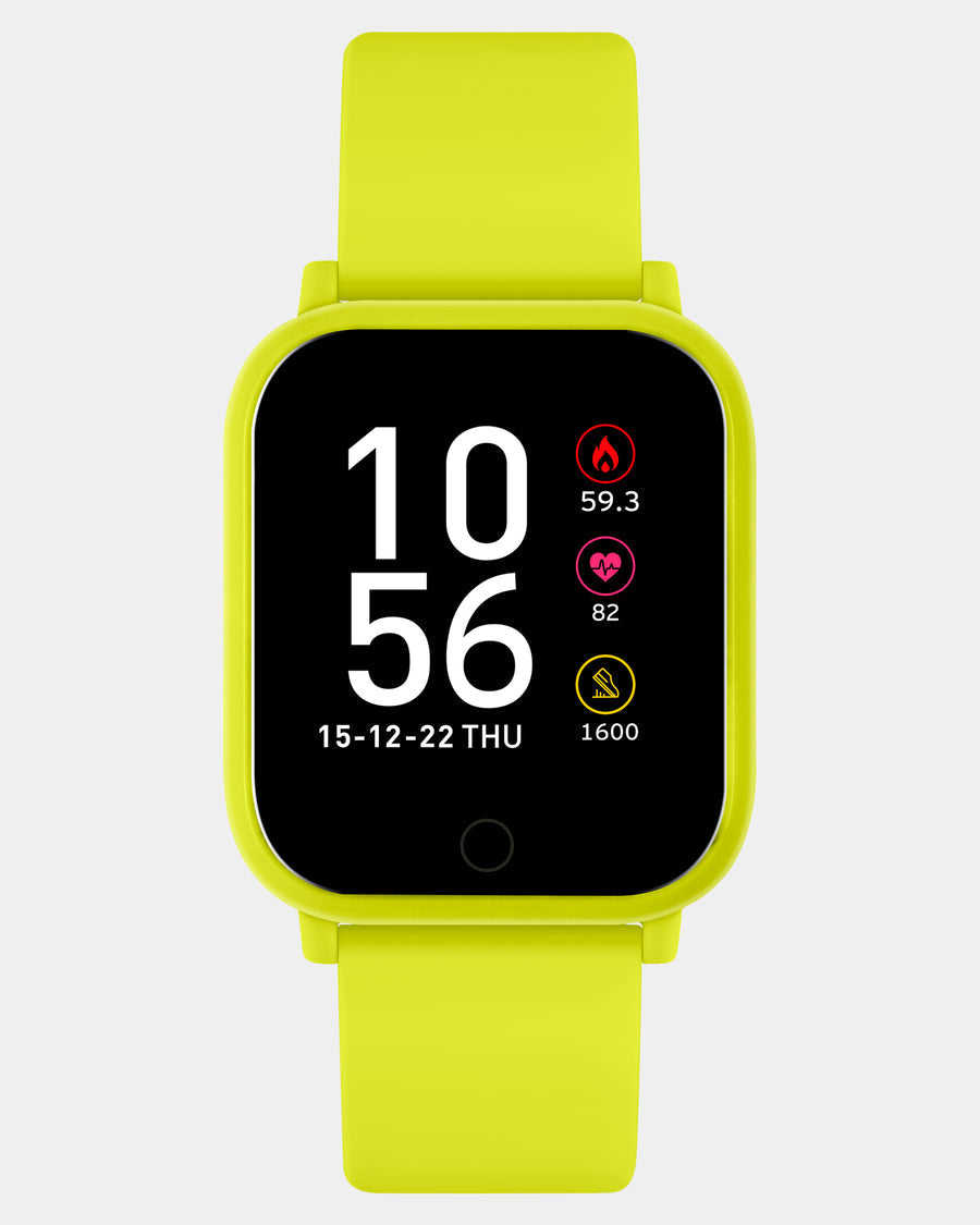 Our classic square watch face, now with a bright lime green silicone sport strap.