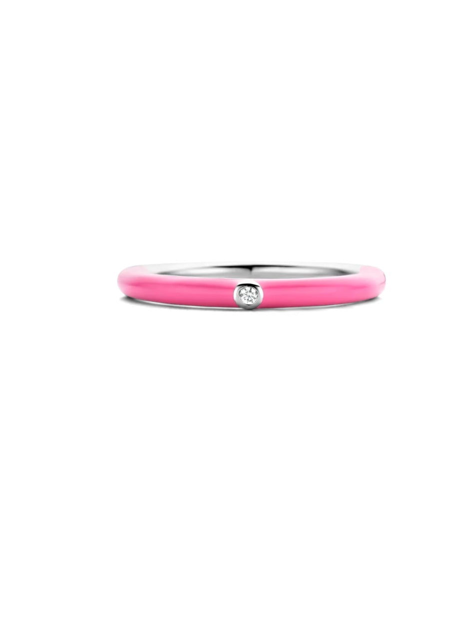 This TI SENTO - Milano silver ring 12225FU has an enamelled fuchsia stone all along the top of its band. At its centre, a shimmering white cubic zirconia has been set by hand. The ring is crafted from 925 sterling silver and coated with a thick layer of rhodium to protect it and keep it luminous. Combine it with a statement piece, stack it with others, or wear it alone; it will always bring light!