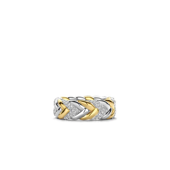 This TI SENTO gold-plated silver ring 12263ZY features an elegant, braided pattern that intertwines silver, pavé and gold-plated silver. The ring is crafted from 925 sterling silver and coated with a thick layer of platinum to protect it and keep it luminous. A classic design with a playful twist.