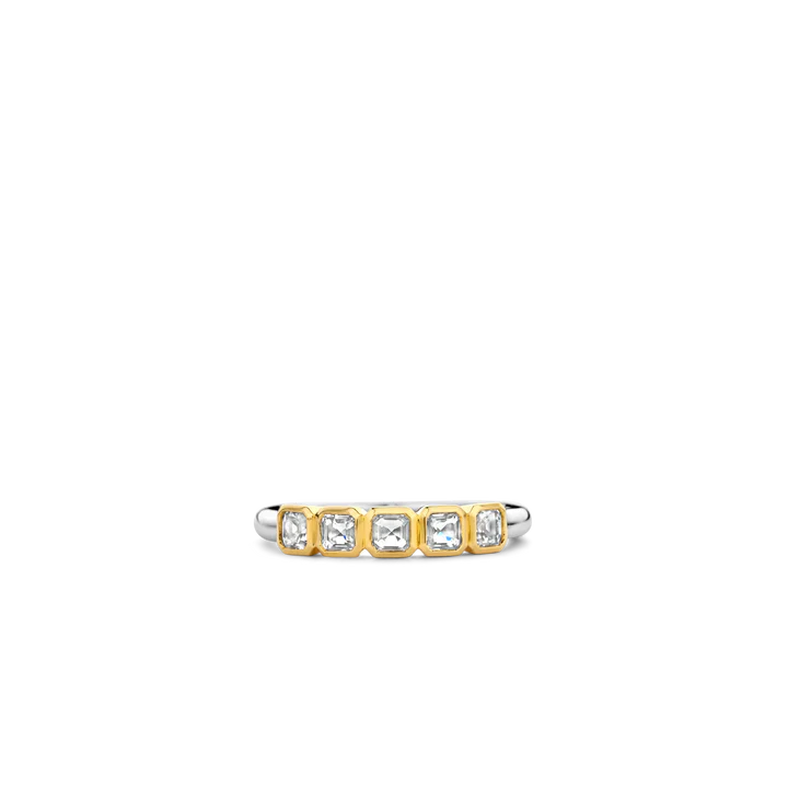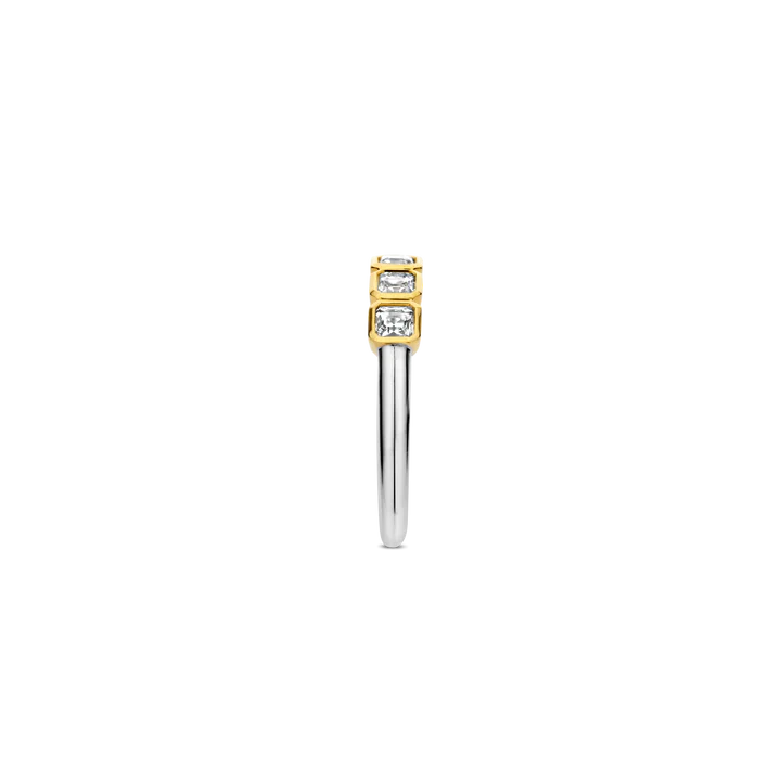 This TI SENTO gold-plated ring 12327ZY flaunts a a stream of square cubic zirconia stones handset within a radiant yellow gold-plated setting. A striking blend of opulence and modern design. Crafted from premium 925 sterling silver and plated with radiant yellow gold, the luxurious arrangement of sparkling cubic zirconia stones adds an irresistible allure to this ring, creating a captivating play of light and sophistication. Its timeless design ensures it seamlessly transitions from formal occasions to everyday glam. Wear it alone or mingle it with other silver or gold-plated pieces, create a stacked masterpiece. Decorate your hands with its enchanting beauty. Like all our jewellery, this ring is nickel-free and hypoallergenic, promising not just style, but also comfort and quality that stands the test of time.