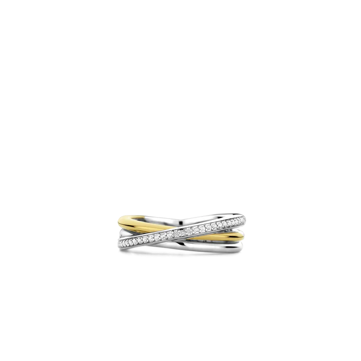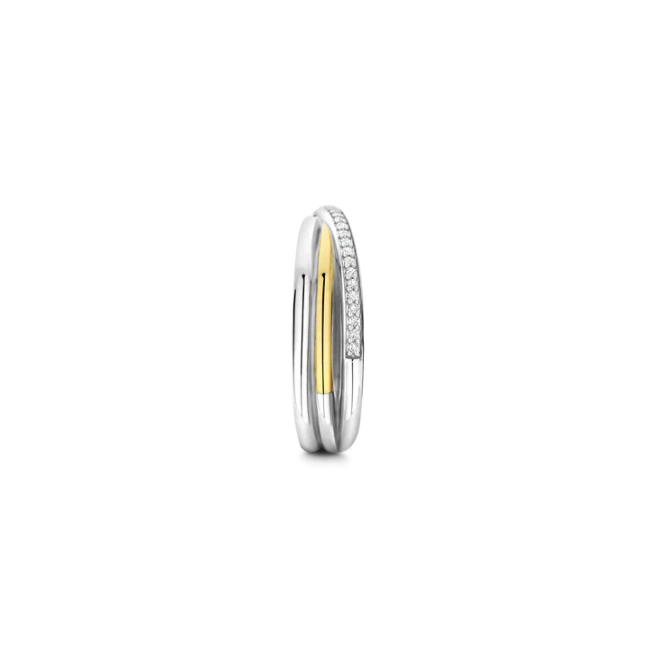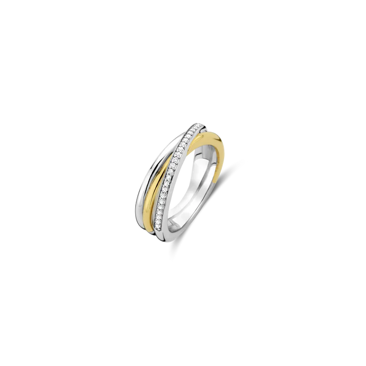 Discover the captivating vintage allure of this TI SENTO gold-plated silver Ring 12346ZY. This piece features two intertwined bands, one crafted from 925 sterling silver and plated with platinum for a cool, contemporary finish, and the other plated in radiant yellow gold for a touch of warmth and luxury. These bands are elegantly crossed by a third band, adorned with a dazzling row of white cubic zirconia stones. The contrasting textures and colors create a visually striking effect, making this ring an elegant statement piece. The intricate design and the sparkling cubic zirconia stones add a touch of modern sophistication. Elevate your everyday look with this stunning accessory. Wear it alone for a bold statement or stack it with other TI SENTO rings for a personalised touch. Crafted with care for sensitive skin, this nickel-free and hypoallergenic ring ensures lasting comfort and quality.