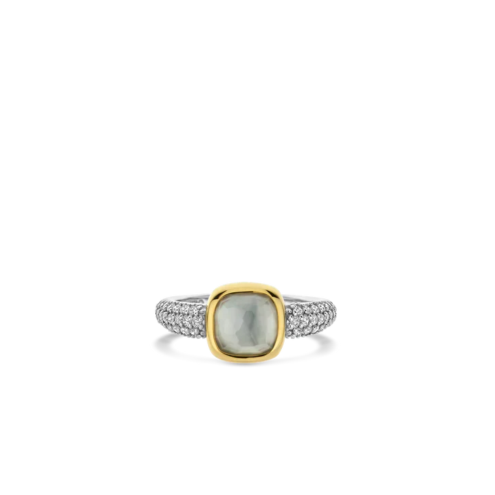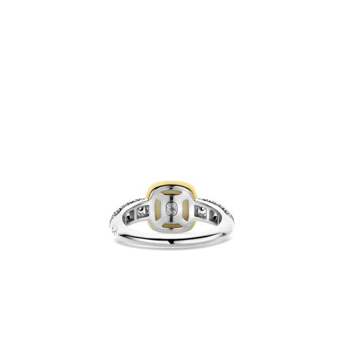 Indulge in vintage-inspired luxury with this TI SENTO gold-plated silver Ring 12331BL. Crafted from 925 sterling silver and plated in yellow gold, this statement piece features a captivating light grey cushion-shaped stone with a shimmering mother-of-pearl lustre set in a luxurious yellow gold setting. The shank of the ring is adorned with a dazzling pave of white cubic zirconia stones, creating a striking contrast and enhancing the overall opulence of the piece. This ring is a testament to the art of fine vintage jewellery, offering a harmonious blend of classic with a touch of modernity. Its bold design and luxurious materials make it a must-have accessory for the modern woman who seeks to add a touch of drama and sophistication to her look. Elevate your everyday style with this head-turning piece. Wear it alone for a bold statement or stack it with other TI SENTO rings for a personalised touch that exudes confidence and allure. Crafted with care for sensitive skin, this nickel-free and hypoallergenic bracelet ensures lasting comfort and quality.