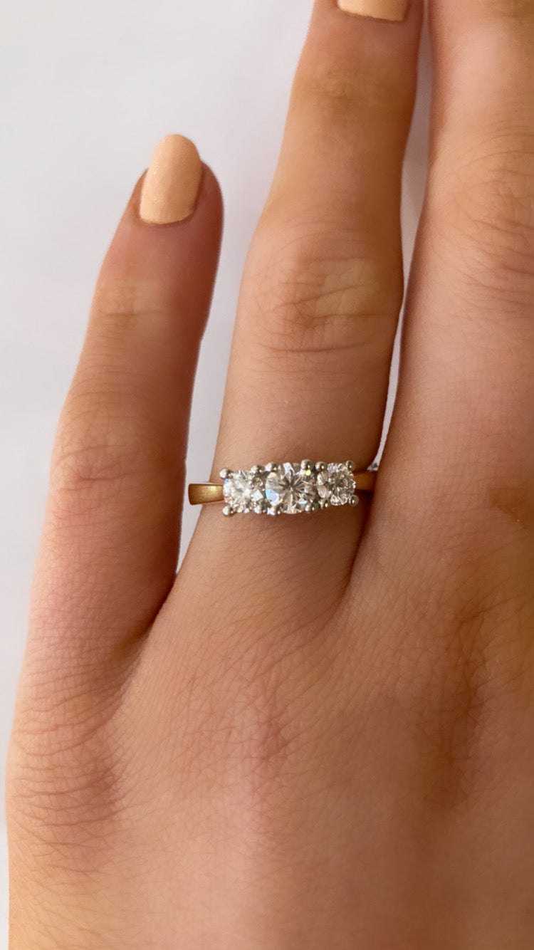 This stunning 18ct yellow gold 3 stone diamond ring is a classic. With an 18ct yellow gold shank and a platinum trilogy setting four claws on each diamond.