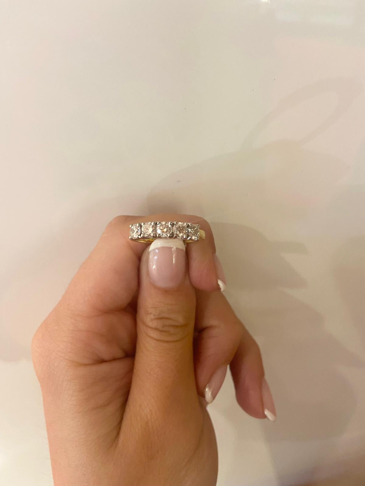 This 5 stone 18ct yellow gold ring is elegant and eye catching. The diamonds sit in a low white gold setting The total diamond carat weight is 1.03ct