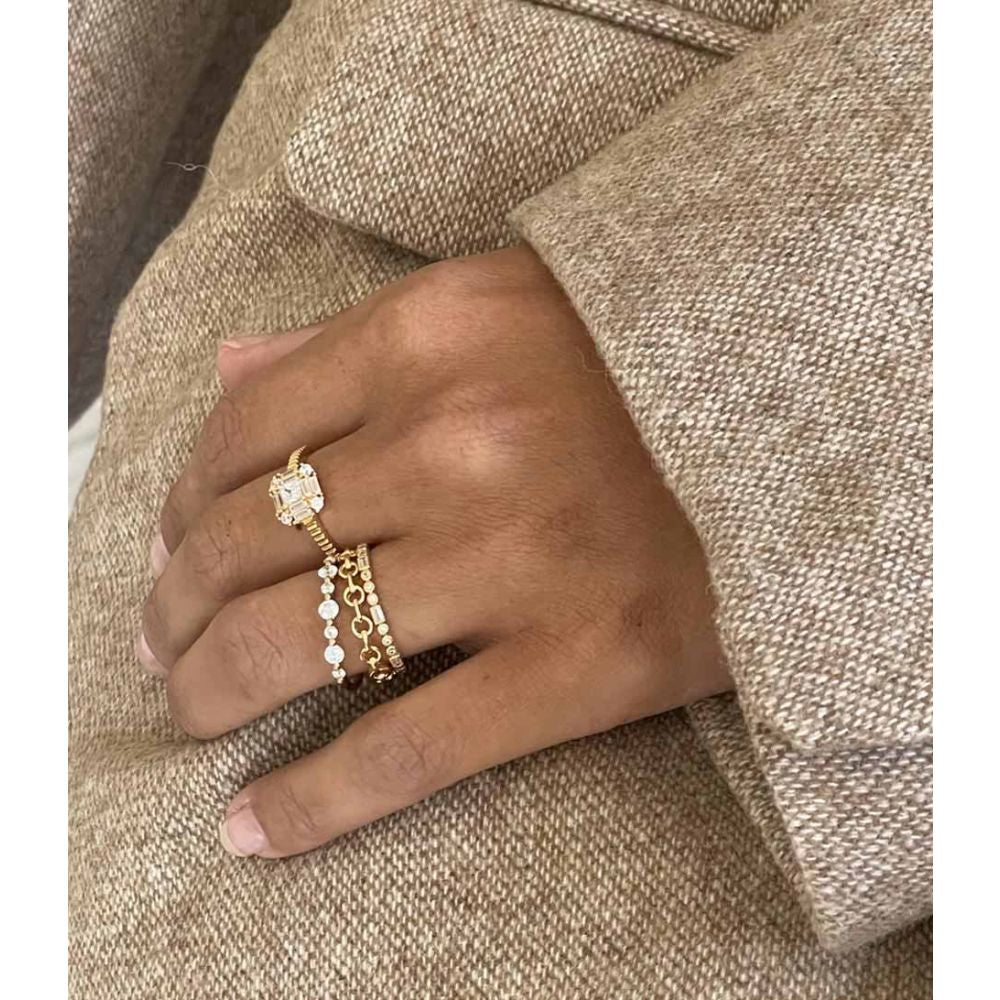 This 24Kae ring is equipped with little round and rectangular stones, perfect to use as a stacking ring or to wear subtle on it's own. The ring is made of 925 sterling silver and plated with 18K gold. Every 24Kae jewelry piece is designed with love and an eye for detail by Kae Sutherland. Each 24Kae ring has the authentic characteristic of a 24Kae engraving.